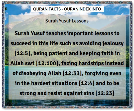 Surah Yusuf Lessons Surah Yusuf teaches important lessons to succeed in this life such as avoiding jealousy [12:5], being patient and keeping faith in Allah swt [12:100], facing hardships instead of disobeying Allah [12:33], forgiving