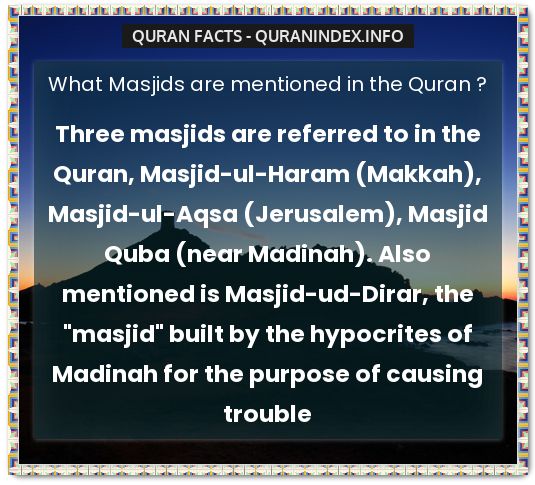 What Masjids are mentioned in the Quran ? Three masjids are referred to in the Quran, Masjid-ul-Haram (Makkah), Masjid-ul-Aqsa (Jerusalem), Masjid Quba (near Madinah). Also mentioned is Masjid-ud-Dirar, the “masjid” built by the hypocrites of