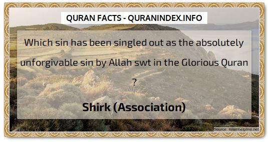 Which sin has been singled out as the absolutely unforgivable sin by Allah swt in the Glorious Quran ? Shirk (Association).