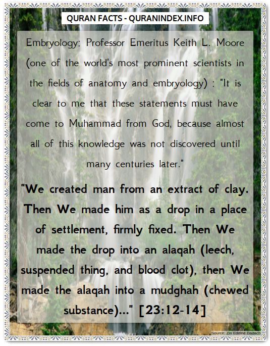 Embryology: Professor Emeritus Keith L. Moore (one of the world’s most prominent scientists in the fields of anatomy and embryology) : “It is clear to me that these statements must have come to Muhammad from