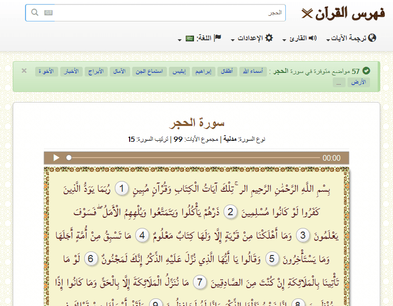 بِسْمِ اللَّهِ الرَّحْمَٰنِ الرَّحِيمِ الر ۚ تِلْكَ آيَاتُ الْكِتَابِ وَقُرْآنٍ مُبِينٍ1رُبَمَا يَوَدُّ الَّذِينَ كَفَرُوا لَوْ كَانُوا مُسْلِمِينَ2ذَرْهُمْ يَأْكُلُوا وَيَتَمَتَّعُوا وَيُلْهِهِمُ الْأَمَلُ ۖ فَسَوْفَ يَعْلَمُونَ3وَمَا أَهْلَكْنَا مِنْ قَرْيَةٍ إِلَّا وَلَهَا كِتَابٌ مَعْلُومٌ4مَا تَسْبِقُ مِنْ أُمَّةٍ أَجَلَهَا وَمَا يَسْتَأْخِرُونَ5وَقَالُوا يَا أَيُّهَا الَّذِي نُزِّلَ عَلَيْهِ الذِّكْرُ إِنَّكَ لَمَجْنُونٌ6لَوْ مَا تَأْتِينَا بِالْمَلَائِكَةِ إِنْ كُنْتَ مِنَ الصَّادِقِينَ7مَا نُنَزِّلُ الْمَلَائِكَةَ إِلَّا بِالْحَقِّ وَمَا كَانُوا إِذًا مُنْظَرِينَ8إِنَّا نَحْنُ نَزَّلْنَا الذِّكْرَ وَإِنَّا لَهُ لَحَافِظُونَ9وَلَقَدْ أَرْسَلْنَا مِنْ قَبْلِكَ فِي شِيَعِ الْأَوَّلِينَ10وَمَا يَأْتِيهِمْ مِنْ رَسُولٍ إِلَّا كَانُوا بِهِ يَسْتَهْزِئُونَ11كَذَٰلِكَ نَسْلُكُهُ فِي قُلُوبِ الْمُجْرِمِينَ12لَا يُؤْمِنُونَ بِهِ ۖ وَقَدْ خَلَتْ سُنَّةُ الْأَوَّلِينَ13وَلَوْ فَتَحْنَا عَلَيْهِمْ بَابًا مِنَ السَّمَاءِ فَظَلُّوا فِيهِ يَعْرُجُونَ14لَقَالُوا إِنَّمَا سُكِّرَتْ أَبْصَارُنَا بَلْ نَحْنُ قَوْمٌ مَسْحُورُونَ15وَلَقَدْ جَعَلْنَا فِي السَّمَاءِ بُرُوجًا وَزَيَّنَّاهَا لِلنَّاظِرِينَ16وَحَفِظْنَاهَا مِنْ كُلِّ شَيْطَانٍ رَجِيمٍ17إِلَّا مَنِ اسْتَرَقَ السَّمْعَ فَأَتْبَعَهُ شِهَابٌ مُبِينٌ18وَالْأَرْضَ مَدَدْنَاهَا وَأَلْقَيْنَا فِيهَا رَوَاسِيَ وَأَنْبَتْنَا فِيهَا مِنْ كُلِّ شَيْءٍ مَوْزُونٍ19وَجَعَلْنَا لَكُمْ فِيهَا مَعَايِشَ وَمَنْ لَسْتُمْ لَهُ بِرَازِقِينَ20وَإِنْ مِنْ شَيْءٍ إِلَّا عِنْدَنَا خَزَائِنُهُ وَمَا نُنَزِّلُهُ إِلَّا بِقَدَرٍ مَعْلُومٍ21وَأَرْسَلْنَا الرِّيَاحَ لَوَاقِحَ فَأَنْزَلْنَا مِنَ السَّمَاءِ مَاءً فَأَسْقَيْنَاكُمُوهُ وَمَا أَنْتُمْ لَهُ بِخَازِنِينَ22وَإِنَّا لَنَحْنُ نُحْيِي وَنُمِيتُ وَنَحْنُ الْوَارِثُونَ23وَلَقَدْ عَلِمْنَا الْمُسْتَقْدِمِينَ مِنْكُمْ وَلَقَدْ عَلِمْنَا الْمُسْتَأْخِرِينَ24وَإِنَّ رَبَّكَ هُوَ يَحْشُرُهُمْ ۚ إِنَّهُ حَكِيمٌ عَلِيمٌ25وَلَقَدْ خَلَقْنَا الْإِنْسَانَ مِنْ صَلْصَالٍ مِنْ حَمَإٍ مَسْنُونٍ26وَالْجَانَّ خَلَقْنَاهُ مِنْ قَبْلُ مِنْ نَارِ السَّمُومِ27وَإِذْ قَالَ رَبُّكَ لِلْمَلَائِكَةِ إِنِّي خَالِقٌ بَشَرًا مِنْ صَلْصَالٍ مِنْ حَمَإٍ مَسْنُونٍ28فَإِذَا سَوَّيْتُهُ وَنَفَخْتُ فِيهِ مِنْ رُوحِي فَقَعُوا لَهُ سَاجِدِينَ29فَسَجَدَ الْمَلَائِكَةُ كُلُّهُمْ أَجْمَعُونَ30إِلَّا إِبْلِيسَ أَبَىٰ أَنْ يَكُونَ مَعَ السَّاجِدِينَ31قَالَ يَا إِبْلِيسُ مَا لَكَ أَلَّا تَكُونَ مَعَ السَّاجِدِينَ32قَالَ لَمْ أَكُنْ لِأَسْجُدَ لِبَشَرٍ خَلَقْتَهُ مِنْ صَلْصَالٍ مِنْ حَمَإٍ مَسْنُونٍ33قَالَ فَاخْرُجْ مِنْهَا فَإِنَّكَ رَجِيمٌ34وَإِنَّ عَلَيْكَ اللَّعْنَةَ إِلَىٰ يَوْمِ الدِّينِ35قَالَ رَبِّ فَأَنْظِرْنِي إِلَىٰ يَوْمِ يُبْعَثُونَ36قَالَ فَإِنَّكَ مِنَ الْمُنْظَرِينَ37إِلَىٰ يَوْمِ الْوَقْتِ الْمَعْلُومِ38قَالَ رَبِّ بِمَا أَغْوَيْتَنِي لَأُزَيِّنَنَّ لَهُمْ فِي الْأَرْضِ وَلَأُغْوِيَنَّهُمْ أَجْمَعِينَ39إِلَّا عِبَادَكَ مِنْهُمُ الْمُخْلَصِينَ40قَالَ هَٰذَا صِرَاطٌ عَلَيَّ مُسْتَقِيمٌ41إِنَّ عِبَادِي لَيْسَ لَكَ عَلَيْهِمْ سُلْطَانٌ إِلَّا مَنِ اتَّبَعَكَ مِنَ الْغَاوِينَ42وَإِنَّ جَهَنَّمَ لَمَوْعِدُهُمْ أَجْمَعِينَ43لَهَا سَبْعَةُ أَبْوَابٍ لِكُلِّ بَابٍ مِنْهُمْ جُزْءٌ مَقْسُومٌ44إِنَّ الْمُتَّقِينَ فِي جَنَّاتٍ وَعُيُونٍ45ادْخُلُوهَا بِسَلَامٍ آمِنِينَ46وَنَزَعْنَا مَا فِي صُدُورِهِمْ مِنْ غِلٍّ إِخْوَانًا عَلَىٰ سُرُرٍ مُتَقَابِلِينَ47لَا يَمَسُّهُمْ فِيهَا نَصَبٌ وَمَا هُمْ مِنْهَا بِمُخْ