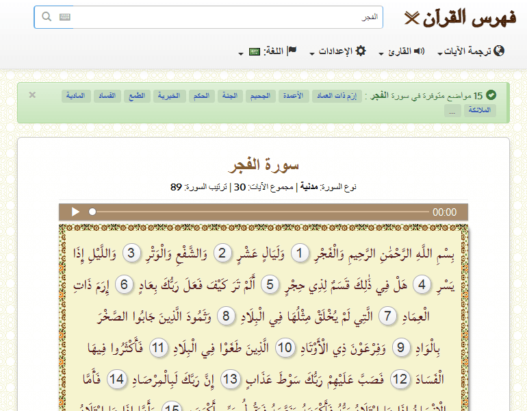 بِسْمِ اللَّهِ الرَّحْمَٰنِ الرَّحِيمِ وَالْفَجْرِ1وَلَيَالٍ عَشْرٍ2وَالشَّفْعِ وَالْوَتْرِ3وَاللَّيْلِ إِذَا يَسْرِ4هَلْ فِي ذَٰلِكَ قَسَمٌ لِذِي حِجْرٍ5أَلَمْ تَرَ كَيْفَ فَعَلَ رَبُّكَ بِعَادٍ6إِرَمَ ذَاتِ الْعِمَادِ7الَّتِي لَمْ يُخْلَقْ مِثْلُهَا فِي الْبِلَادِ8وَثَمُودَ الَّذِينَ جَابُوا الصَّخْرَ بِالْوَادِ9وَفِرْعَوْنَ ذِي الْأَوْتَادِ10الَّذِينَ طَغَوْا فِي الْبِلَادِ11فَأَكْثَرُوا فِيهَا الْفَسَادَ12فَصَبَّ عَلَيْهِمْ رَبُّكَ سَوْطَ عَذَابٍ13إِنَّ رَبَّكَ لَبِالْمِرْصَادِ14فَأَمَّا الْإِنْسَانُ إِذَا مَا ابْتَلَاهُ رَبُّهُ فَأَكْرَمَهُ وَنَعَّمَهُ فَيَقُولُ رَبِّي أَكْرَمَنِ15وَأَمَّا إِذَا مَا ابْتَلَاهُ فَقَدَرَ عَلَيْهِ رِزْقَهُ فَيَقُولُ رَبِّي أَهَانَنِ16كَلَّا ۖ بَلْ لَا تُكْرِمُونَ الْيَتِيمَ17وَلَا تَحَاضُّونَ عَلَىٰ طَعَامِ الْمِسْكِينِ18وَتَأْكُلُونَ التُّرَاثَ أَكْلًا لَمًّا19وَتُحِبُّونَ الْمَالَ حُبًّا جَمًّا20كَلَّا إِذَا دُكَّتِ الْأَرْضُ دَكًّا دَكًّا21وَجَاءَ رَبُّكَ وَالْمَلَكُ صَفًّا صَفًّا22وَجِيءَ يَوْمَئِذٍ بِجَهَنَّمَ ۚ يَوْمَئِذٍ يَتَذَكَّرُ الْإِنْسَانُ وَأَنَّىٰ لَهُ الذِّكْرَىٰ23يَقُولُ يَا لَيْتَنِي قَدَّمْتُ لِحَيَاتِي24فَيَوْمَئِذٍ لَا يُعَذِّبُ عَذَابَهُ أَحَدٌ25وَلَا يُوثِقُ وَثَاقَهُ أَحَدٌ26يَا أَيَّتُهَا النَّفْسُ الْمُطْمَئِنَّةُ27ارْجِعِي إِلَىٰ رَبِّكِ رَاضِيَةً مَرْضِيَّةً28فَادْخُلِي فِي عِبَادِي29وَادْخُلِي جَنَّتِي30