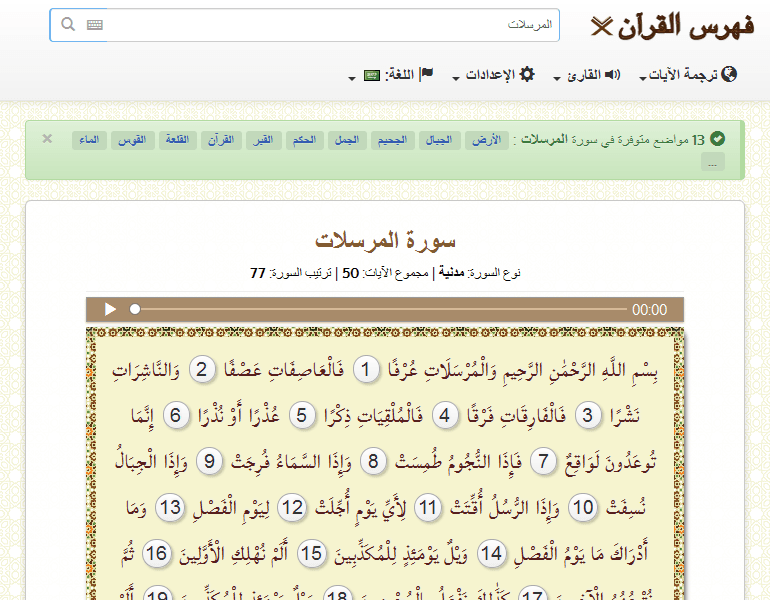 البحث عن 39 مواضع متوفرة في سورة المرسلات : الإيمان المؤمن الركوع الإبل القصر الناقة الخلق اليوم الميت الشراب الأرض ...