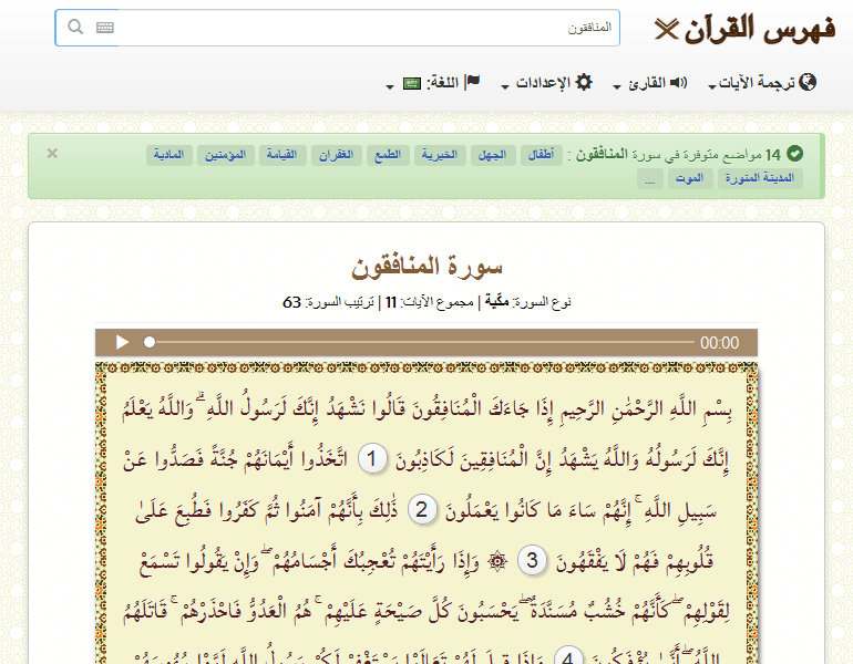 البحث عن 48 مواضع متوفرة في سورة المنافقون : الذلة الإستكبار الإيمان المؤمن الصيحة الزكاة الطفل الزكاة اللباس الموت الكافر ...