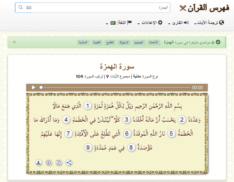 بِسْمِ اللَّهِ الرَّحْمَٰنِ الرَّحِيمِ وَيْلٌ لِكُلِّ هُمَزَةٍ لُمَزَةٍ1الَّذِي جَمَعَ مَالًا وَعَدَّدَهُ2يَحْسَبُ أَنَّ مَالَهُ أَخْلَدَهُ3كَلَّا ۖ لَيُنْبَذَنَّ فِي الْحُطَمَةِ4وَمَا أَدْرَاكَ مَا الْحُطَمَةُ5نَارُ اللَّهِ الْمُوقَدَةُ6الَّتِي تَطَّلِعُ عَلَى الْأَفْئِدَةِ7إِنَّهَا عَلَيْهِمْ مُؤْصَدَةٌ8فِي عَمَدٍ مُمَدَّدَةٍ9