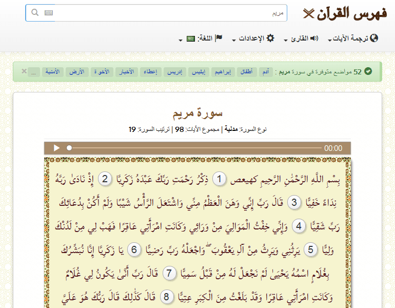 بِسْمِ اللَّهِ الرَّحْمَٰنِ الرَّحِيمِ كهيعص1ذِكْرُ رَحْمَتِ رَبِّكَ عَبْدَهُ زَكَرِيَّا2إِذْ نَادَىٰ رَبَّهُ نِدَاءً خَفِيًّا3قَالَ رَبِّ إِنِّي وَهَنَ الْعَظْمُ مِنِّي وَاشْتَعَلَ الرَّأْسُ شَيْبًا وَلَمْ أَكُنْ بِدُعَائِكَ رَبِّ شَقِيًّا4وَإِنِّي خِفْتُ الْمَوَالِيَ مِنْ وَرَائِي وَكَانَتِ امْرَأَتِي عَاقِرًا فَهَبْ لِي مِنْ لَدُنْكَ وَلِيًّا5يَرِثُنِي وَيَرِثُ مِنْ آلِ يَعْقُوبَ ۖ وَاجْعَلْهُ رَبِّ رَضِيًّا6يَا زَكَرِيَّا إِنَّا نُبَشِّرُكَ بِغُلَامٍ اسْمُهُ يَحْيَىٰ لَمْ نَجْعَلْ لَهُ مِنْ قَبْلُ سَمِيًّا7قَالَ رَبِّ أَنَّىٰ يَكُونُ لِي غُلَامٌ وَكَانَتِ امْرَأَتِي عَاقِرًا وَقَدْ بَلَغْتُ مِنَ الْكِبَرِ عِتِيًّا8قَالَ كَذَٰلِكَ قَالَ رَبُّكَ هُوَ عَلَيَّ هَيِّنٌ وَقَدْ خَلَقْتُكَ مِنْ قَبْلُ وَلَمْ تَكُ شَيْئًا9قَالَ رَبِّ اجْعَلْ لِي آيَةً ۚ قَالَ آيَتُكَ أَلَّا تُكَلِّمَ النَّاسَ ثَلَاثَ لَيَالٍ سَوِيًّا10فَخَرَجَ عَلَىٰ قَوْمِهِ مِنَ الْمِحْرَابِ فَأَوْحَىٰ إِلَيْهِمْ أَنْ سَبِّحُوا بُكْرَةً وَعَشِيًّا11يَا يَحْيَىٰ خُذِ الْكِتَابَ بِقُوَّةٍ ۖ وَآتَيْنَاهُ الْحُكْمَ صَبِيًّا12وَحَنَانًا مِنْ لَدُنَّا وَزَكَاةً ۖ وَكَانَ تَقِيًّا13وَبَرًّا بِوَالِدَيْهِ وَلَمْ يَكُنْ جَبَّارًا عَصِيًّا14وَسَلَامٌ عَلَيْهِ يَوْمَ وُلِدَ وَيَوْمَ يَمُوتُ وَيَوْمَ يُبْعَثُ حَيًّا15وَاذْكُرْ فِي الْكِتَابِ مَرْيَمَ إِذِ انْتَبَذَتْ مِنْ أَهْلِهَا مَكَانًا شَرْقِيًّا16فَاتَّخَذَتْ مِنْ دُونِهِمْ حِجَابًا فَأَرْسَلْنَا إِلَيْهَا رُوحَنَا فَتَمَثَّلَ لَهَا بَشَرًا سَوِيًّا17قَالَتْ إِنِّي أَعُوذُ بِالرَّحْمَٰنِ مِنْكَ إِنْ كُنْتَ تَقِيًّا18قَالَ إِنَّمَا أَنَا رَسُولُ رَبِّكِ لِأَهَبَ لَكِ غُلَامًا زَكِيًّا19قَالَتْ أَنَّىٰ يَكُونُ لِي غُلَامٌ وَلَمْ يَمْسَسْنِي بَشَرٌ وَلَمْ أَكُ بَغِيًّا20قَالَ كَذَٰلِكِ قَالَ رَبُّكِ هُوَ عَلَيَّ هَيِّنٌ ۖ وَلِنَجْعَلَهُ آيَةً لِلنَّاسِ وَرَحْمَةً مِنَّا ۚ وَكَانَ أَمْرًا مَقْضِيًّا21۞ فَحَمَلَتْهُ فَانْتَبَذَتْ بِهِ مَكَانًا قَصِيًّا22فَأَجَاءَهَا الْمَخَاضُ إِلَىٰ جِذْعِ النَّخْلَةِ قَالَتْ يَا لَيْتَنِي مِتُّ قَبْلَ هَٰذَا وَكُنْتُ نَسْيًا مَنْسِيًّا23فَنَادَاهَا مِنْ تَحْتِهَا أَلَّا تَحْزَنِي قَدْ جَعَلَ رَبُّكِ تَحْتَكِ سَرِيًّا24وَهُزِّي إِلَيْكِ بِجِذْعِ النَّخْلَةِ تُسَاقِطْ عَلَيْكِ رُطَبًا جَنِيًّا25فَكُلِي وَاشْرَبِي وَقَرِّي عَيْنًا ۖ فَإِمَّا تَرَيِنَّ مِنَ الْبَشَرِ أَحَدًا فَقُولِي إِنِّي نَذَرْتُ لِلرَّحْمَٰنِ صَوْمًا فَلَنْ أُكَلِّمَ الْيَوْمَ إِنْسِيًّا26فَأَتَتْ بِهِ قَوْمَهَا تَحْمِلُهُ ۖ قَالُوا يَا مَرْيَمُ لَقَدْ جِئْتِ شَيْئًا فَرِيًّا27يَا أُخْتَ هَارُونَ مَا كَانَ أَبُوكِ امْرَأَ سَوْءٍ وَمَا كَانَتْ أُمُّكِ بَغِيًّا28فَأَشَارَتْ إِلَيْهِ ۖ قَالُوا كَيْفَ نُكَلِّمُ مَنْ كَانَ فِي الْمَهْدِ صَبِيًّا29قَالَ إِنِّي عَبْدُ اللَّهِ آتَانِيَ الْكِتَابَ وَجَعَلَنِي نَبِيًّا30وَجَعَلَنِي مُبَارَكًا أَيْنَ مَا كُنْتُ وَأَوْصَانِي بِالصَّلَاةِ وَالزَّكَاةِ مَا دُمْتُ حَيًّا31وَبَرًّا بِوَالِدَتِي وَلَمْ يَجْعَلْنِي جَبَّارًا شَقِيًّا32وَالسَّلَامُ عَلَيَّ يَوْمَ وُلِدْتُ وَيَوْمَ أَمُوتُ وَيَوْمَ أُبْعَثُ حَيًّا33ذَٰلِكَ عِيسَى ابْنُ مَرْيَمَ ۚ قَوْلَ الْحَقِّ الَّذِي فِيهِ يَمْتَرُونَ34مَا كَانَ لِلَّهِ أَنْ يَتَّخِذَ مِنْ وَلَدٍ ۖ سُبْحَانَهُ ۚ إِذَا قَضَىٰ أَمْرًا فَإِنَّمَا يَقُولُ لَهُ كُنْ فَيَكُونُ35وَإِنَّ اللَّهَ رَبِّي وَرَبُّكُمْ فَاعْبُدُوهُ ۚ هَٰذَا صِرَاطٌ مُسْتَقِيمٌ36فَاخْتَلَفَ الْأَحْزَابُ مِنْ بَيْنِهِمْ ۖ فَوَيْلٌ لِلَّذِينَ كَفَرُوا مِنْ مَشْهَدِ يَوْمٍ عَظِيمٍ37أَسْمِعْ بِهِمْ وَأَبْصِرْ يَوْم