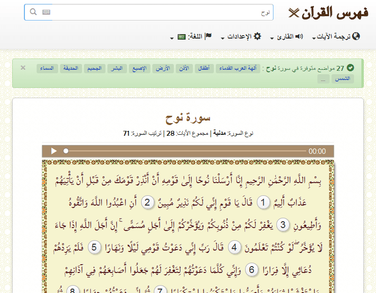 البحث عن 62 مواضع متوفرة في سورة نوح : السفينة الإستكبار الضلالة علم الفلك الإيمان المؤمن الميكانيكا السماوية الطفل اللباس الخلق المصير ...
