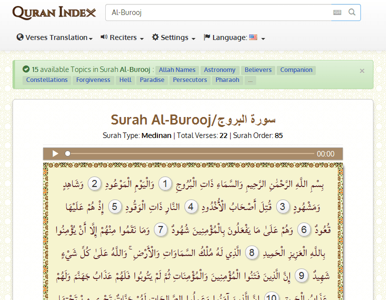بِسْمِ اللَّهِ الرَّحْمَٰنِ الرَّحِيمِ وَالسَّمَاءِ ذَاتِ الْبُرُوجِ1وَالْيَوْمِ الْمَوْعُودِ2وَشَاهِدٍ وَمَشْهُودٍ3قُتِلَ أَصْحَابُ الْأُخْدُودِ4النَّارِ ذَاتِ الْوَقُودِ5إِذْ هُمْ عَلَيْهَا قُعُودٌ6وَهُمْ عَلَىٰ مَا يَفْعَلُونَ بِالْمُؤْمِنِينَ شُهُودٌ7وَمَا نَقَمُوا مِنْهُمْ إِلَّا أَنْ يُؤْمِنُوا بِاللَّهِ الْعَزِيزِ الْحَمِيدِ8الَّذِي لَهُ مُلْكُ السَّمَاوَاتِ وَالْأَرْضِ ۚ وَاللَّهُ عَلَىٰ كُلِّ شَيْءٍ شَهِيدٌ9إِنَّ الَّذِينَ فَتَنُوا الْمُؤْمِنِينَ وَالْمُؤْمِنَاتِ ثُمَّ لَمْ يَتُوبُوا فَلَهُمْ عَذَابُ جَهَنَّمَ وَلَهُمْ عَذَابُ الْحَرِيقِ10إِنَّ الَّذِينَ آمَنُوا وَعَمِلُوا الصَّالِحَاتِ لَهُمْ جَنَّاتٌ تَجْرِي مِنْ تَحْتِهَا الْأَنْهَارُ ۚ ذَٰلِكَ الْفَوْزُ الْكَبِيرُ11إِنَّ بَطْشَ رَبِّكَ لَشَدِيدٌ12إِنَّهُ هُوَ يُبْدِئُ وَيُعِيدُ13وَهُوَ الْغَفُورُ الْوَدُودُ14ذُو الْعَرْشِ الْمَجِيدُ15فَعَّالٌ لِمَا يُرِيدُ16هَلْ أَتَاكَ حَدِيثُ الْجُنُودِ17فِرْعَوْنَ وَثَمُودَ18بَلِ الَّذِينَ كَفَرُوا فِي تَكْذِيبٍ19وَاللَّهُ مِنْ وَرَائِهِمْ مُحِيطٌ20بَلْ هُوَ قُرْآنٌ مَجِيدٌ21فِي لَوْحٍ مَحْفُوظٍ22