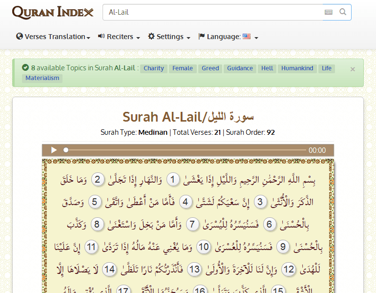 1By the night when it covers2And [by] the day when it appears3And [by] He who created the male and female,4Indeed, your efforts are diverse.5As for he who gives and fears Allah6And believes in the best [reward],7We will ease him toward ease.8But as for he who withholds and considers himself free of need9And denies the best [reward],10We will ease him toward difficulty.11And what will his wealth avail him when he falls?12Indeed, [incumbent] upon Us is guidance.13And indeed, to Us belongs the Hereafter and the first [life].14So I have warned you of a Fire which is blazing.15None will [enter to] burn therein except the most wretched one.16Who had denied and turned away.17But the righteous one will avoid it -18[He] who gives [from] his wealth to purify himself19And not [giving] for anyone who has [done him] a favor to be rewarded20But only seeking the countenance of his Lord, Most High.21And he is going to be satisfied.
