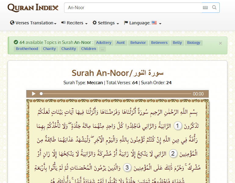 بِسْمِ اللَّهِ الرَّحْمَٰنِ الرَّحِيمِ سُورَةٌ أَنْزَلْنَاهَا وَفَرَضْنَاهَا وَأَنْزَلْنَا فِيهَا آيَاتٍ بَيِّنَاتٍ لَعَلَّكُمْ تَذَكَّرُونَ1الزَّانِيَةُ وَ الزَّانِي فَاجْلِدُوا كُلَّ وَاحِدٍ مِنْهُمَا مِائَةَ جَلْدَةٍ ۖ وَلَا تَأْخُذْكُمْ بِهِمَا رَأْفَةٌ فِي دِينِ اللَّهِ إِنْ كُنْتُمْ تُؤْمِنُونَ بِاللَّهِ وَالْيَوْمِ الْآخِرِ ۖ وَلْيَشْهَدْ عَذَابَهُمَا طَائِفَةٌ مِنَ الْمُؤْمِنِينَ2الزَّانِي لَا يَنْكِحُ إِلَّا زَانِيَةً أَوْ مُشْرِكَةً وَالزَّانِيَةُ لَا يَنْكِحُهَا إِلَّا زَانٍ أَوْ مُشْرِكٌ ۚ وَحُرِّمَ ذَٰلِكَ عَلَى الْمُؤْمِنِينَ3وَالَّذِينَ يَرْمُونَ الْمُحْصَنَاتِ ثُمَّ لَمْ يَأْتُوا بِأَرْبَعَةِ شُهَدَاءَ فَاجْلِدُوهُمْ ثَمَانِينَ جَلْدَةً وَلَا تَقْبَلُوا لَهُمْ شَهَادَةً أَبَدًا ۚ وَأُولَٰئِكَ هُمُ الْفَاسِقُونَ4إِلَّا الَّذِينَ تَابُوا مِنْ بَعْدِ ذَٰلِكَ وَأَصْلَحُوا فَإِنَّ اللَّهَ غَفُورٌ رَحِيمٌ5وَالَّذِينَ يَرْمُونَ أَزْوَاجَهُمْ وَلَمْ يَكُنْ لَهُمْ شُهَدَاءُ إِلَّا أَنْفُسُهُمْ فَشَهَادَةُ أَحَدِهِمْ أَرْبَعُ شَهَادَاتٍ بِاللَّهِ ۙ إِنَّهُ لَمِنَ الصَّادِقِينَ6وَالْخَامِسَةُ أَنَّ لَعْنَتَ اللَّهِ عَلَيْهِ إِنْ كَانَ مِنَ الْكَاذِبِينَ7وَيَدْرَأُ عَنْهَا الْعَذَابَ أَنْ تَشْهَدَ أَرْبَعَ شَهَادَاتٍ بِاللَّهِ ۙ إِنَّهُ لَمِنَ الْكَاذِبِينَ8وَالْخَامِسَةَ أَنَّ غَضَبَ اللَّهِ عَلَيْهَا إِنْ كَانَ مِنَ الصَّادِقِينَ9وَلَوْلَا فَضْلُ اللَّهِ عَلَيْكُمْ وَرَحْمَتُهُ وَأَنَّ اللَّهَ تَوَّابٌ حَكِيمٌ10إِنَّ الَّذِينَ جَاءُوا بِالْإِفْكِ عُصْبَةٌ مِنْكُمْ ۚ لَا تَحْسَبُوهُ شَرًّا لَكُمْ ۖ بَلْ هُوَ خَيْرٌ لَكُمْ ۚ لِكُلِّ امْرِئٍ مِنْهُمْ مَا اكْتَسَبَ مِنَ الْإِثْمِ ۚ وَالَّذِي تَوَلَّىٰ كِبْرَهُ مِنْهُمْ لَهُ عَذَابٌ عَظِيمٌ11لَوْلَا إِذْ سَمِعْتُمُوهُ ظَنَّ الْمُؤْمِنُونَ وَالْمُؤْمِنَاتُ بِأَنْفُسِهِمْ خَيْرًا وَقَالُوا هَٰذَا إِفْكٌ مُبِينٌ12لَوْلَا جَاءُوا عَلَيْهِ بِأَرْبَعَةِ شُهَدَاءَ ۚ فَإِذْ لَمْ يَأْتُوا بِالشُّهَدَاءِ فَأُولَٰئِكَ عِنْدَ اللَّهِ هُمُ الْكَاذِبُونَ13وَلَوْلَا فَضْلُ اللَّهِ عَلَيْكُمْ وَرَحْمَتُهُ فِي الدُّنْيَا وَالْآخِرَةِ لَمَسَّكُمْ فِي مَا أَفَضْتُمْ فِيهِ عَذَابٌ عَظِيمٌ14إِذْ تَلَقَّوْنَهُ بِأَلْسِنَتِكُمْ وَتَقُولُونَ بِأَفْوَاهِكُمْ مَا لَيْسَ لَكُمْ بِهِ عِلْمٌ وَتَحْسَبُونَهُ هَيِّنًا وَهُوَ عِنْدَ اللَّهِ عَظِيمٌ15وَلَوْلَا إِذْ سَمِعْتُمُوهُ قُلْتُمْ مَا يَكُونُ لَنَا أَنْ نَتَكَلَّمَ بِهَٰذَا سُبْحَانَكَ هَٰذَا بُهْتَانٌ عَظِيمٌ16يَعِظُكُمُ اللَّهُ أَنْ تَعُودُوا لِمِثْلِهِ أَبَدًا إِنْ كُنْتُمْ مُؤْمِنِينَ17وَيُبَيِّنُ اللَّهُ لَكُمُ الْآيَاتِ ۚ وَاللَّهُ عَلِيمٌ حَكِيمٌ18إِنَّ الَّذِينَ يُحِبُّونَ أَنْ تَشِيعَ الْفَاحِشَةُ فِي الَّذِينَ آمَنُوا لَهُمْ عَذَابٌ أَلِيمٌ فِي الدُّنْيَا وَالْآخِرَةِ ۚ وَاللَّهُ يَعْلَمُ وَأَنْتُمْ لَا تَعْلَمُونَ19وَلَوْلَا فَضْلُ اللَّهِ عَلَيْكُمْ وَرَحْمَتُهُ وَأَنَّ اللَّهَ رَءُوفٌ رَحِيمٌ20۞ يَا أَيُّهَا الَّذِينَ آمَنُوا لَا تَتَّبِعُوا خُطُوَاتِ الشَّيْطَانِ ۚ وَمَنْ يَتَّبِعْ خُطُوَاتِ الشَّيْطَانِ فَإِنَّهُ يَأْمُرُ بِالْفَحْشَاءِ وَالْمُنْكَرِ ۚ وَلَوْلَا فَضْلُ اللَّهِ عَلَيْكُمْ وَرَحْمَتُهُ مَا زَكَىٰ مِنْكُمْ مِنْ أَحَدٍ أَبَدًا وَلَٰكِنَّ اللَّهَ يُزَكِّي مَنْ يَشَاءُ ۗ وَاللَّهُ سَمِيعٌ عَلِيمٌ21وَلَا يَأْتَلِ أُولُو الْفَضْلِ مِنْكُمْ وَالسَّعَةِ أَنْ يُؤْتُوا أُولِي الْقُرْبَىٰ وَالْمَسَاكِينَ وَالْمُهَاجِرِينَ فِي سَبِيلِ اللَّهِ ۖ وَلْيَعْفُوا وَلْيَصْفَحُوا ۗ أَلَا تُحِبُّونَ أَنْ يَغْفِرَ اللَّهُ لَكُمْ ۗ وَاللَّهُ غَفُورٌ