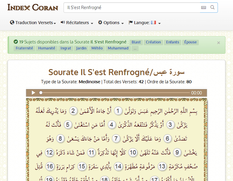 Rechercher 50 Sujets disponibles dans la Sourate Il s'est Renfrogné : Cri Fraternité Enfant Création Mort Mécréant Détournement Goutte Poussière Nourriture Jardin ...