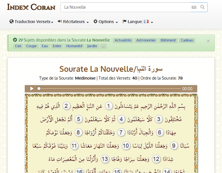 بِسْمِ اللَّهِ الرَّحْمَٰنِ الرَّحِيمِ عَمَّ يَتَسَاءَلُونَ1عَنِ النَّبَإِ الْعَظِيمِ2الَّذِي هُمْ فِيهِ مُخْتَلِفُونَ3كَلَّا سَيَعْلَمُونَ4ثُمَّ كَلَّا سَيَعْلَمُونَ5أَلَمْ نَجْعَلِ الْأَرْضَ مِهَادًا6وَالْجِبَالَ أَوْتَادًا7وَخَلَقْنَاكُمْ أَزْوَاجًا8وَجَعَلْنَا نَوْمَكُمْ سُبَاتًا9وَجَعَلْنَا اللَّيْلَ لِبَاسًا10وَجَعَلْنَا النَّهَارَ مَعَاشًا11وَبَنَيْنَا فَوْقَكُمْ سَبْعًا شِدَادًا12وَجَعَلْنَا سِرَاجًا وَهَّاجًا13وَأَنْزَلْنَا مِنَ الْمُعْصِرَاتِ مَاءً ثَجَّاجًا14لِنُخْرِجَ بِهِ حَبًّا وَنَبَاتًا15وَجَنَّاتٍ أَلْفَافًا16إِنَّ يَوْمَ الْفَصْلِ كَانَ مِيقَاتًا17يَوْمَ يُنْفَخُ فِي الصُّورِ فَتَأْتُونَ أَفْوَاجًا18وَفُتِحَتِ السَّمَاءُ فَكَانَتْ أَبْوَابًا19وَسُيِّرَتِ الْجِبَالُ فَكَانَتْ سَرَابًا20إِنَّ جَهَنَّمَ كَانَتْ مِرْصَادًا21لِلطَّاغِينَ مَآبًا22لَابِثِينَ فِيهَا أَحْقَابًا23لَا يَذُوقُونَ فِيهَا بَرْدًا وَلَا شَرَابًا24إِلَّا حَمِيمًا وَغَسَّاقًا25جَزَاءً وِفَاقًا26إِنَّهُمْ كَانُوا لَا يَرْجُونَ حِسَابًا27وَكَذَّبُوا بِآيَاتِنَا كِذَّابًا28وَكُلَّ شَيْءٍ أَحْصَيْنَاهُ كِتَابًا29فَذُوقُوا فَلَنْ نَزِيدَكُمْ إِلَّا عَذَابًا30إِنَّ لِلْمُتَّقِينَ مَفَازًا31حَدَائِقَ وَأَعْنَابًا32وَكَوَاعِبَ أَتْرَابًا33وَكَأْسًا دِهَاقًا34لَا يَسْمَعُونَ فِيهَا لَغْوًا وَلَا كِذَّابًا35جَزَاءً مِنْ رَبِّكَ عَطَاءً حِسَابًا36رَبِّ السَّمَاوَاتِ وَالْأَرْضِ وَمَا بَيْنَهُمَا الرَّحْمَٰنِ ۖ لَا يَمْلِكُونَ مِنْهُ خِطَابًا37يَوْمَ يَقُومُ الرُّوحُ وَالْمَلَائِكَةُ صَفًّا ۖ لَا يَتَكَلَّمُونَ إِلَّا مَنْ أَذِنَ لَهُ الرَّحْمَٰنُ وَقَالَ صَوَابًا38ذَٰلِكَ الْيَوْمُ الْحَقُّ ۖ فَمَنْ شَاءَ اتَّخَذَ إِلَىٰ رَبِّهِ مَآبًا39إِنَّا أَنْذَرْنَاكُمْ عَذَابًا قَرِيبًا يَوْمَ يَنْظُرُ الْمَرْءُ مَا قَدَّمَتْ يَدَاهُ وَيَقُولُ الْكَافِرُ يَا لَيْتَنِي كُنْتُ تُرَابًا40