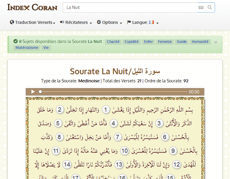 Rechercher 27 Sujets disponibles dans la Sourate La Nuit : Charité Zakât Création Avarice Femelle Cupidité Guide Enfer Secours Au Delà Humanité ...