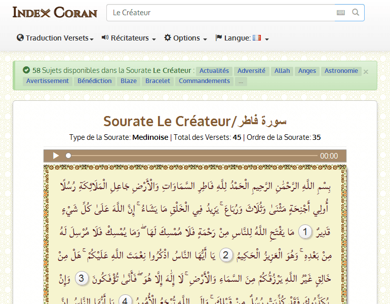 Rechercher 147 Sujets disponibles dans la Sourate Le Créateur : Parure Allah Noms Allah Anges Orgueil Égarement Astronomie Croyance Croyant Fournaise Bienfait ...