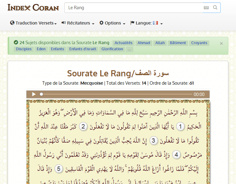بِسْمِ اللَّهِ الرَّحْمَٰنِ الرَّحِيمِ سَبَّحَ لِلَّهِ مَا فِي السَّمَاوَاتِ وَمَا فِي الْأَرْضِ ۖ وَهُوَ الْعَزِيزُ الْحَكِيمُ1يَا أَيُّهَا الَّذِينَ آمَنُوا لِمَ تَقُولُونَ مَا لَا تَفْعَلُونَ2كَبُرَ مَقْتًا عِنْدَ اللَّهِ أَنْ تَقُولُوا مَا لَا تَفْعَلُونَ3إِنَّ اللَّهَ يُحِبُّ الَّذِينَ يُقَاتِلُونَ فِي سَبِيلِهِ صَفًّا كَأَنَّهُمْ بُنْيَانٌ مَرْصُوصٌ4وَإِذْ قَالَ مُوسَىٰ لِقَوْمِهِ يَا قَوْمِ لِمَ تُؤْذُونَنِي وَقَدْ تَعْلَمُونَ أَنِّي رَسُولُ اللَّهِ إِلَيْكُمْ ۖ فَلَمَّا زَاغُوا أَزَاغَ اللَّهُ قُلُوبَهُمْ ۚ وَاللَّهُ لَا يَهْدِي الْقَوْمَ الْفَاسِقِينَ5وَإِذْ قَالَ عِيسَى ابْنُ مَرْيَمَ يَا بَنِي إِسْرَائِيلَ إِنِّي رَسُولُ اللَّهِ إِلَيْكُمْ مُصَدِّقًا لِمَا بَيْنَ يَدَيَّ مِنَ التَّوْرَاةِ وَمُبَشِّرًا بِرَسُولٍ يَأْتِي مِنْ بَعْدِي اسْمُهُ أَحْمَدُ ۖ فَلَمَّا جَاءَهُمْ بِالْبَيِّنَاتِ قَالُوا هَٰذَا سِحْرٌ مُبِينٌ6وَمَنْ أَظْلَمُ مِمَّنِ افْتَرَىٰ عَلَى اللَّهِ الْكَذِبَ وَهُوَ يُدْعَىٰ إِلَى الْإِسْلَامِ ۚ وَاللَّهُ لَا يَهْدِي الْقَوْمَ الظَّالِمِينَ7يُرِيدُونَ لِيُطْفِئُوا نُورَ اللَّهِ بِأَفْوَاهِهِمْ وَاللَّهُ مُتِمُّ نُورِهِ وَلَوْ كَرِهَ الْكَافِرُونَ8هُوَ الَّذِي أَرْسَلَ رَسُولَهُ بِالْهُدَىٰ وَدِينِ الْحَقِّ لِيُظْهِرَهُ عَلَى الدِّينِ كُلِّهِ وَلَوْ كَرِهَ الْمُشْرِكُونَ9يَا أَيُّهَا الَّذِينَ آمَنُوا هَلْ أَدُلُّكُمْ عَلَىٰ تِجَارَةٍ تُنْجِيكُمْ مِنْ عَذَابٍ أَلِيمٍ10تُؤْمِنُونَ بِاللَّهِ وَرَسُولِهِ وَتُجَاهِدُونَ فِي سَبِيلِ اللَّهِ بِأَمْوَالِكُمْ وَأَنْفُسِكُمْ ۚ ذَٰلِكُمْ خَيْرٌ لَكُمْ إِنْ كُنْتُمْ تَعْلَمُونَ11يَغْفِرْ لَكُمْ ذُنُوبَكُمْ وَيُدْخِلْكُمْ جَنَّاتٍ تَجْرِي مِنْ تَحْتِهَا الْأَنْهَارُ وَمَسَاكِنَ طَيِّبَةً فِي جَنَّاتِ عَدْنٍ ۚ ذَٰلِكَ الْفَوْزُ الْعَظِيمُ12وَأُخْرَىٰ تُحِبُّونَهَا ۖ نَصْرٌ مِنَ اللَّهِ وَفَتْحٌ قَرِيبٌ ۗ وَبَشِّرِ الْمُؤْمِنِينَ13يَا أَيُّهَا الَّذِينَ آمَنُوا كُونُوا أَنْصَارَ اللَّهِ كَمَا قَالَ عِيسَى ابْنُ مَرْيَمَ لِلْحَوَارِيِّينَ مَنْ أَنْصَارِي إِلَى اللَّهِ ۖ قَالَ الْحَوَارِيُّونَ نَحْنُ أَنْصَارُ اللَّهِ ۖ فَآمَنَتْ طَائِفَةٌ مِنْ بَنِي إِسْرَائِيلَ وَكَفَرَتْ طَائِفَةٌ ۖ فَأَيَّدْنَا الَّذِينَ آمَنُوا عَلَىٰ عَدُوِّهِمْ فَأَصْبَحُوا ظَاهِرِينَ14