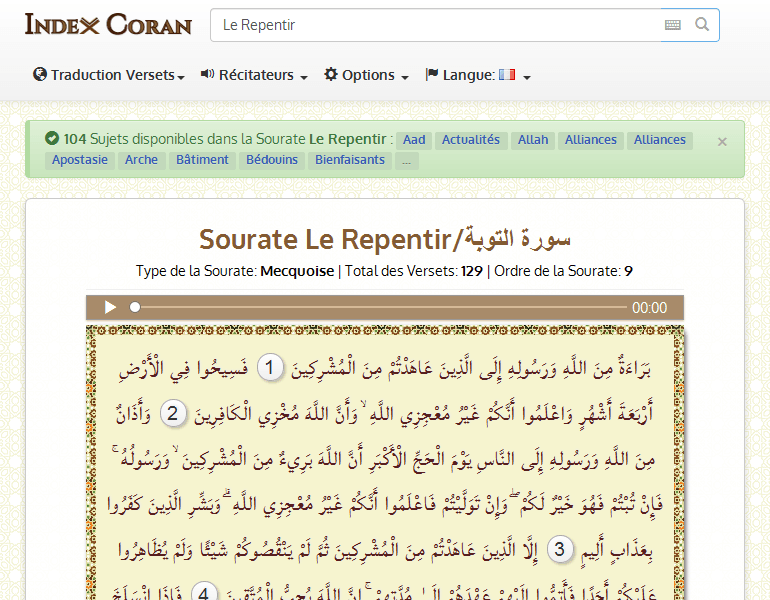 Rechercher 246 Sujets disponibles dans la Sourate Le Repentir : Aad Abaissement Abraham Engagement Allah Noms Allah Alliances Colère Apostasie Arche Égarement ...