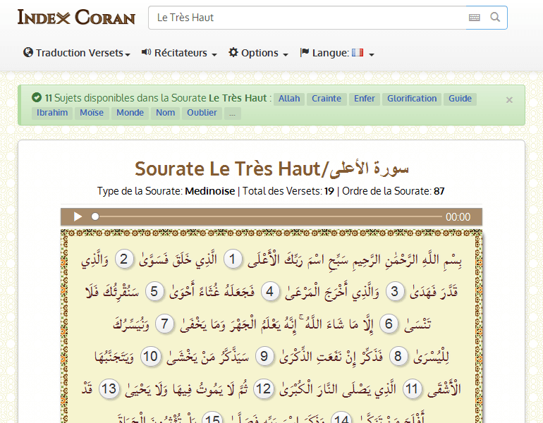Rechercher 31 Sujets disponibles dans la Sourate Le Très Haut : Abraham Allah Création Mort Crainte Oublier Glorification Guide Enfer Au Delà Jean le Baptiste ...