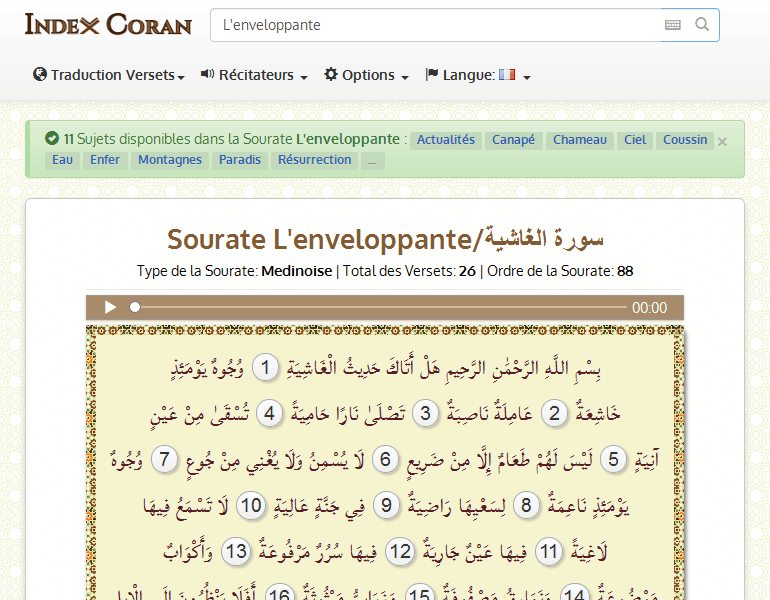 Rechercher 25 Sujets disponibles dans la Sourate L'Enveloppante : Chameau Chamelle Divans Création Coussin Mécréant Nourriture Bonheur Ouïe Paradis Enfer ...