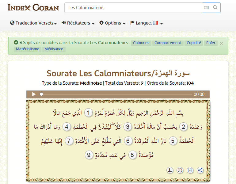 Rechercher 11 Sujets disponibles dans la Sourate Les Calomniateurs : Médisance Comportement Colonne Éternel Combustible Cupidité Enfer Matérialisme Biens Médisance Argent ...