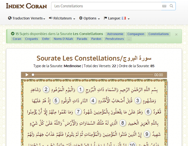 بِسْمِ اللَّهِ الرَّحْمَٰنِ الرَّحِيمِ وَالسَّمَاءِ ذَاتِ الْبُرُوجِ1وَالْيَوْمِ الْمَوْعُودِ2وَشَاهِدٍ وَمَشْهُودٍ3قُتِلَ أَصْحَابُ الْأُخْدُودِ4النَّارِ ذَاتِ الْوَقُودِ5إِذْ هُمْ عَلَيْهَا قُعُودٌ6وَهُمْ عَلَىٰ مَا يَفْعَلُونَ بِالْمُؤْمِنِينَ شُهُودٌ7وَمَا نَقَمُوا مِنْهُمْ إِلَّا أَنْ يُؤْمِنُوا بِاللَّهِ الْعَزِيزِ الْحَمِيدِ8الَّذِي لَهُ مُلْكُ السَّمَاوَاتِ وَالْأَرْضِ ۚ وَاللَّهُ عَلَىٰ كُلِّ شَيْءٍ شَهِيدٌ9إِنَّ الَّذِينَ فَتَنُوا الْمُؤْمِنِينَ وَالْمُؤْمِنَاتِ ثُمَّ لَمْ يَتُوبُوا فَلَهُمْ عَذَابُ جَهَنَّمَ وَلَهُمْ عَذَابُ الْحَرِيقِ10إِنَّ الَّذِينَ آمَنُوا وَعَمِلُوا الصَّالِحَاتِ لَهُمْ جَنَّاتٌ تَجْرِي مِنْ تَحْتِهَا الْأَنْهَارُ ۚ ذَٰلِكَ الْفَوْزُ الْكَبِيرُ11إِنَّ بَطْشَ رَبِّكَ لَشَدِيدٌ12إِنَّهُ هُوَ يُبْدِئُ وَيُعِيدُ13وَهُوَ الْغَفُورُ الْوَدُودُ14ذُو الْعَرْشِ الْمَجِيدُ15فَعَّالٌ لِمَا يُرِيدُ16هَلْ أَتَاكَ حَدِيثُ الْجُنُودِ17فِرْعَوْنَ وَثَمُودَ18بَلِ الَّذِينَ كَفَرُوا فِي تَكْذِيبٍ19وَاللَّهُ مِنْ وَرَائِهِمْ مُحِيطٌ20بَلْ هُوَ قُرْآنٌ مَجِيدٌ21فِي لَوْحٍ مَحْفُوظٍ22