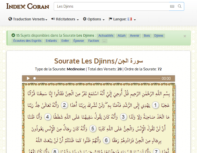 بِسْمِ اللَّهِ الرَّحْمَٰنِ الرَّحِيمِ قُلْ أُوحِيَ إِلَيَّ أَنَّهُ اسْتَمَعَ نَفَرٌ مِنَ الْجِنِّ فَقَالُوا إِنَّا سَمِعْنَا قُرْآنًا عَجَبًا1يَهْدِي إِلَى الرُّشْدِ فَآمَنَّا بِهِ ۖ وَلَنْ نُشْرِكَ بِرَبِّنَا أَحَدًا2وَأَنَّهُ تَعَالَىٰ جَدُّ رَبِّنَا مَا اتَّخَذَ صَاحِبَةً وَلَا وَلَدًا3وَأَنَّهُ كَانَ يَقُولُ سَفِيهُنَا عَلَى اللَّهِ شَطَطًا4وَأَنَّا ظَنَنَّا أَنْ لَنْ تَقُولَ الْإِنْسُ وَالْجِنُّ عَلَى اللَّهِ كَذِبًا5وَأَنَّهُ كَانَ رِجَالٌ مِنَ الْإِنْسِ يَعُوذُونَ بِرِجَالٍ مِنَ الْجِنِّ فَزَادُوهُمْ رَهَقًا6وَأَنَّهُمْ ظَنُّوا كَمَا ظَنَنْتُمْ أَنْ لَنْ يَبْعَثَ اللَّهُ أَحَدًا7وَأَنَّا لَمَسْنَا السَّمَاءَ فَوَجَدْنَاهَا مُلِئَتْ حَرَسًا شَدِيدًا وَشُهُبًا8وَأَنَّا كُنَّا نَقْعُدُ مِنْهَا مَقَاعِدَ لِلسَّمْعِ ۖ فَمَنْ يَسْتَمِعِ الْآنَ يَجِدْ لَهُ شِهَابًا رَصَدًا9وَأَنَّا لَا نَدْرِي أَشَرٌّ أُرِيدَ بِمَنْ فِي الْأَرْضِ أَمْ أَرَادَ بِهِمْ رَبُّهُمْ رَشَدًا10وَأَنَّا مِنَّا الصَّالِحُونَ وَمِنَّا دُونَ ذَٰلِكَ ۖ كُنَّا طَرَائِقَ قِدَدًا11وَأَنَّا ظَنَنَّا أَنْ لَنْ نُعْجِزَ اللَّهَ فِي الْأَرْضِ وَلَنْ نُعْجِزَهُ هَرَبًا12وَأَنَّا لَمَّا سَمِعْنَا الْهُدَىٰ آمَنَّا بِهِ ۖ فَمَنْ يُؤْمِنْ بِرَبِّهِ فَلَا يَخَافُ بَخْسًا وَلَا رَهَقًا13وَأَنَّا مِنَّا الْمُسْلِمُونَ وَمِنَّا الْقَاسِطُونَ ۖ فَمَنْ أَسْلَمَ فَأُولَٰئِكَ تَحَرَّوْا رَشَدًا14وَأَمَّا الْقَاسِطُونَ فَكَانُوا لِجَهَنَّمَ حَطَبًا15وَأَنْ لَوِ اسْتَقَامُوا عَلَى الطَّرِيقَةِ لَأَسْقَيْنَاهُمْ مَاءً غَدَقًا16لِنَفْتِنَهُمْ فِيهِ ۚ وَمَنْ يُعْرِضْ عَنْ ذِكْرِ رَبِّهِ يَسْلُكْهُ عَذَابًا صَعَدًا17وَأَنَّ الْمَسَاجِدَ لِلَّهِ فَلَا تَدْعُوا مَعَ اللَّهِ أَحَدًا18وَأَنَّهُ لَمَّا قَامَ عَبْدُ اللَّهِ يَدْعُوهُ كَادُوا يَكُونُونَ عَلَيْهِ لِبَدًا19قُلْ إِنَّمَا أَدْعُو رَبِّي وَلَا أُشْرِكُ بِهِ أَحَدًا20قُلْ إِنِّي لَا أَمْلِكُ لَكُمْ ضَرًّا وَلَا رَشَدًا21قُلْ إِنِّي لَنْ يُجِيرَنِي مِنَ اللَّهِ أَحَدٌ وَلَنْ أَجِدَ مِنْ دُونِهِ مُلْتَحَدًا22إِلَّا بَلَاغًا مِنَ اللَّهِ وَرِسَالَاتِهِ ۚ وَمَنْ يَعْصِ اللَّهَ وَرَسُولَهُ فَإِنَّ لَهُ نَارَ جَهَنَّمَ خَالِدِينَ فِيهَا أَبَدًا23حَتَّىٰ إِذَا رَأَوْا مَا يُوعَدُونَ فَسَيَعْلَمُونَ مَنْ أَضْعَفُ نَاصِرًا وَأَقَلُّ عَدَدًا24قُلْ إِنْ أَدْرِي أَقَرِيبٌ مَا تُوعَدُونَ أَمْ يَجْعَلُ لَهُ رَبِّي أَمَدًا25عَالِمُ الْغَيْبِ فَلَا يُظْهِرُ عَلَىٰ غَيْبِهِ أَحَدًا26إِلَّا مَنِ ارْتَضَىٰ مِنْ رَسُولٍ فَإِنَّهُ يَسْلُكُ مِنْ بَيْنِ يَدَيْهِ وَمِنْ خَلْفِهِ رَصَدًا27لِيَعْلَمَ أَنْ قَدْ أَبْلَغُوا رِسَالَاتِ رَبِّهِمْ وَأَحَاطَ بِمَا لَدَيْهِمْ وَأَحْصَىٰ كُلَّ شَيْءٍ عَدَدًا28