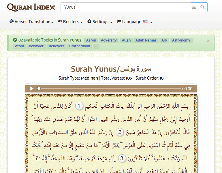 Search 209 available Topics in Surah Yunus : Aaron Abasement Admonition Adornment Allah Allah names Ancestors Animal Ark Arrogance Astray ...