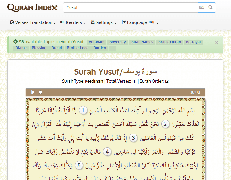 Search 169 available Topics in Surah Yusuf : Abraham Alcohol Allah names Ancestors Astray Belief Believer Betrayal Blame Blessing Bread ...